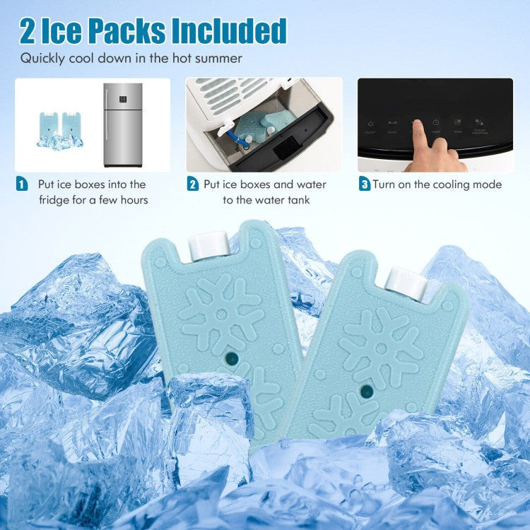 Stay refreshed all day with the 3-in-1 Evaporative Air Fan. This compact unit combines a fan, air cooler, and humidifier for efficient indoor cooling. With 3 wind modes, 3 speed settings, a 9-hour timer, and smooth oscillation, delivers a customizable cooling experience for any room. Its quiet performance, remote-controlled convenience, and sleek design make it ideal for bedrooms, offices, or living spaces. Move it easily using the built-in handles and smooth-rolling caster wheels—comfort follows you wherever you go.