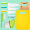 - Complete Set: Includes 4 ergonomic knives, a wooden cutting aid, a colorful cutting board, a vegetable peeler, and a wave cutter for creative fun.