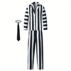 Striped Halloween movie costume suits are the perfect choice for those looking to recreate iconic film looks or make a fashionable statement at costume parties. This 3-piece ensemble features a bold black and white striped pattern, a tailored long sleeve jacket, comfortable pants, and a sleek black tie. Crafted from a soft blend of polyester and spandex, it offers flexibility and comfort while delivering a polished appearance for Halloween or cosplay events.