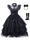 Gothic Halloween movie costume dresses with layered ruffles offer a unique vintage flair that brings character-inspired fashion to life. This full costume set includes a tiered midi dress with ruffled layers, a classic polo collar, a wide belt to accentuate the waist, a bow headband, and matching over-the-knee socks. Made from woven polyester, the fabric holds its shape for a structured and elegant silhouette, making it ideal for cosplay, costume parties, and vintage Halloween looks.