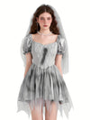 This Halloween corpse bride costume is designed for gothic flair and spooky charm. With a puff sleeve mini dress and flowing tulle skirt, it delivers a dramatic effect that stands out at every party. The square neckline and lace accents add vintage elegance, making this the perfect outfit for those who want to look hauntingly gorgeous this Halloween.